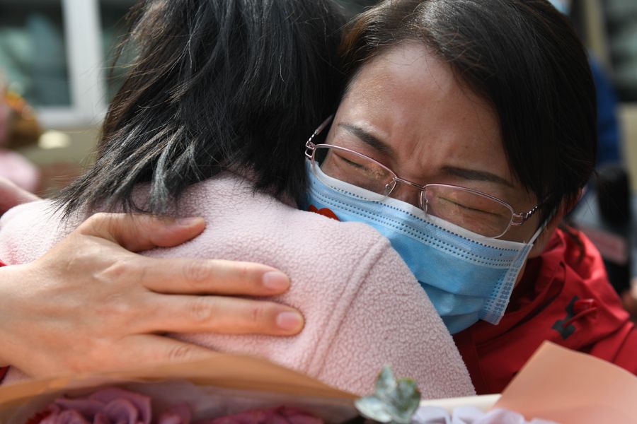 Huo Jiajia (R), a medical worker who aided the fight against COVID-19 in Wuhan, hugs her daughter Yao Ruyu after a 14-day quarantine at the First Affiliated Hospital of Anhui Medical University in Hefei, east China's Anhui Province, April 14, 2020. (Xinhua/Zhang Duan)