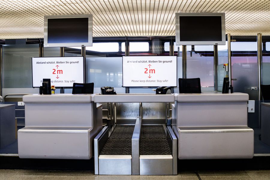 Signs to notice passengers keeping distance are seen at Berlin Tegel Airport in Berlin, capital of Germany, April 9, 2020. (Photo by Binh Truong/Xinhua)
