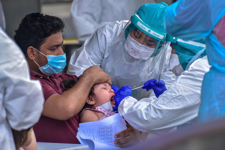 A medical staff member takes sample from a child at a COVID-19 testing point in Kuala Lumpur, Malaysia, April 15, 2020. (Photo by Chong Voon Chung/Xinhua)