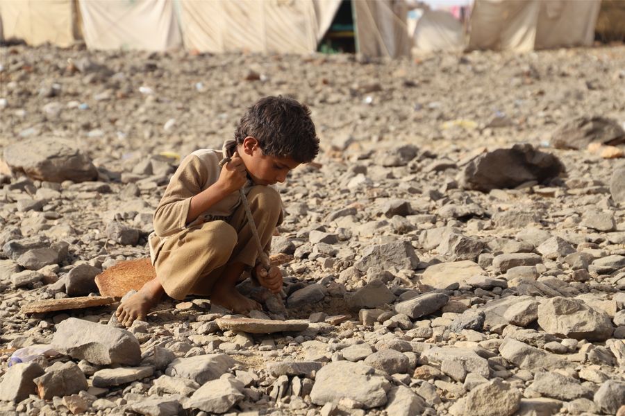 A displaced child plays at a displaced camp in Haradh District in Hajjah province, Yemen, April 7, 2020. (Photo by Mohammed Alwafi/Xinhua)