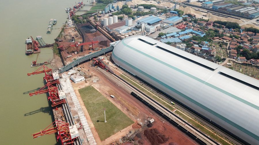 Aerial photo taken on April 16, 2020 shows a "capsule"-shaped bulk-cargo warehouse in Yueyang, central China's Hunan Province.(Xinhua/Chen Zhenhai)■
