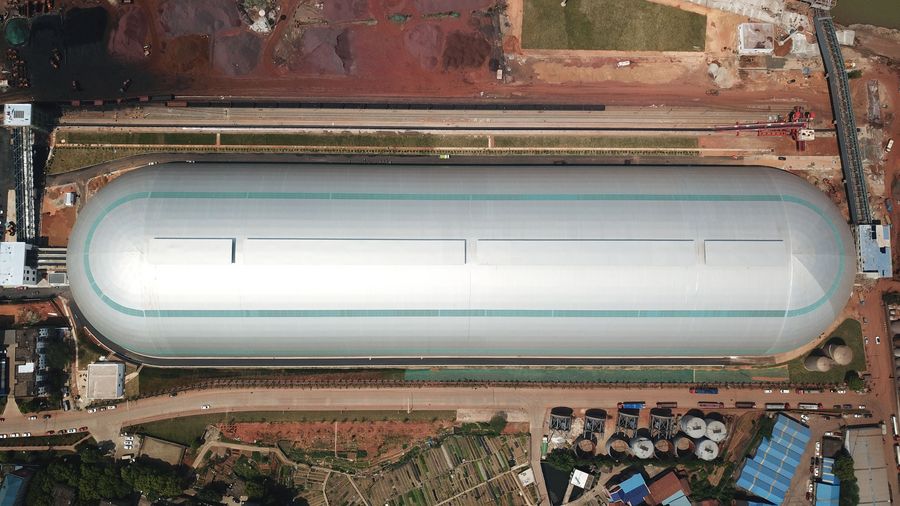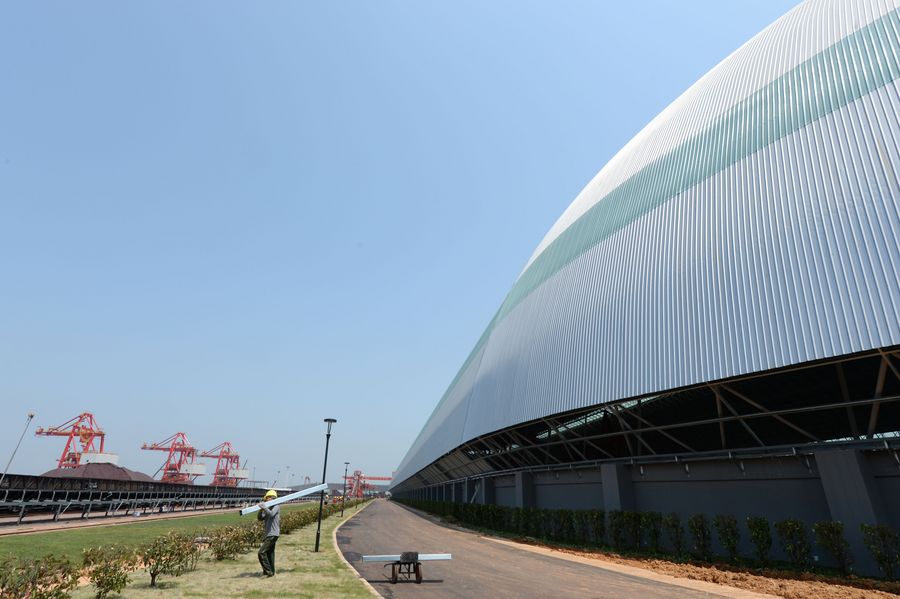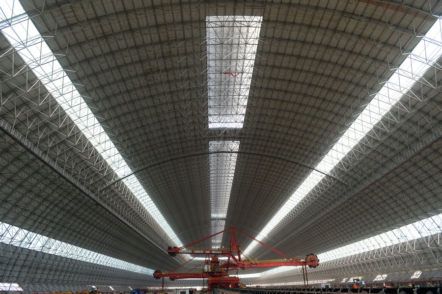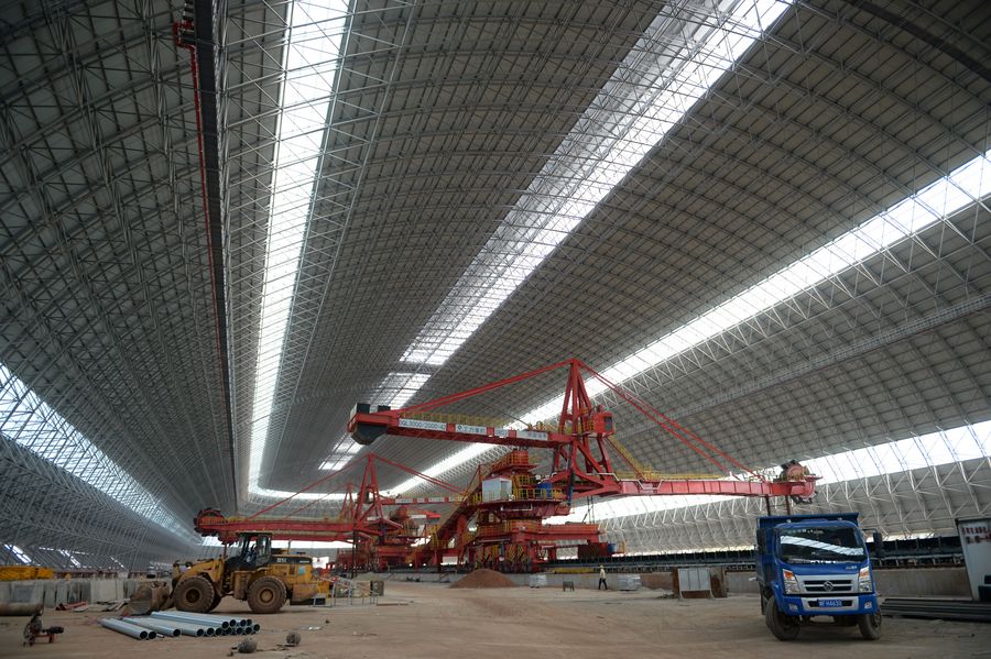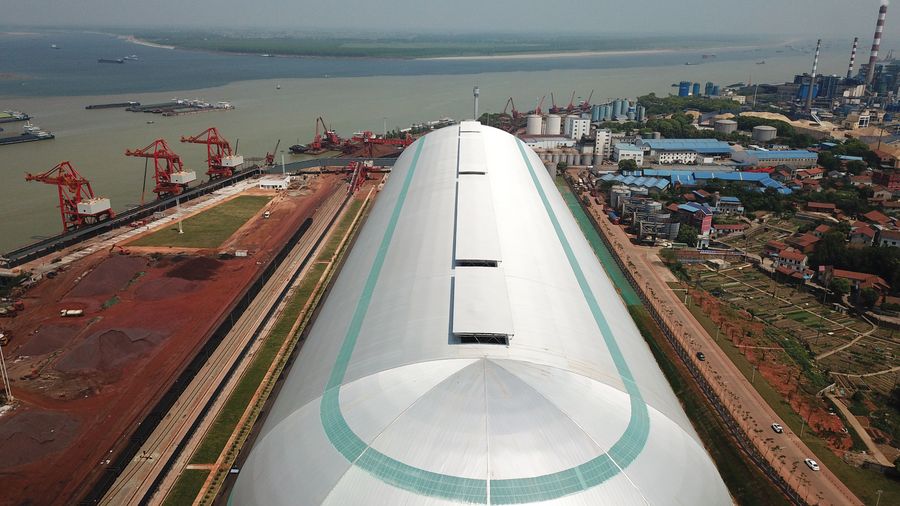 Photo taken on April 16, 2020 shows the interior scene of a "capsule"-shaped bulk-cargo warehouse in Yueyang, central China's Hunan Province.(Xinhua/Chen Zhenhai)
