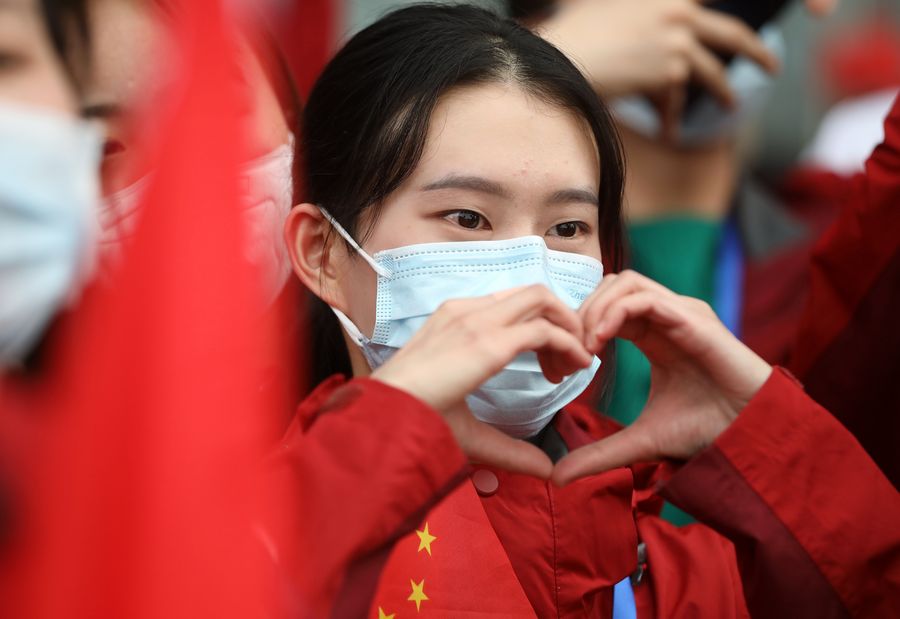 A medical worker gestures to say goodbye to local residents at Wuhan Railway Station in Wuhan, central China's Hubei Province, April 7, 2020. The last batch of 186 medical workers from Hunan Province returned home on Tuesday after aiding the fight against the COVID-19 pandemic in central China's Hubei Province. (Photo by Zhao Jun/Xinhua)