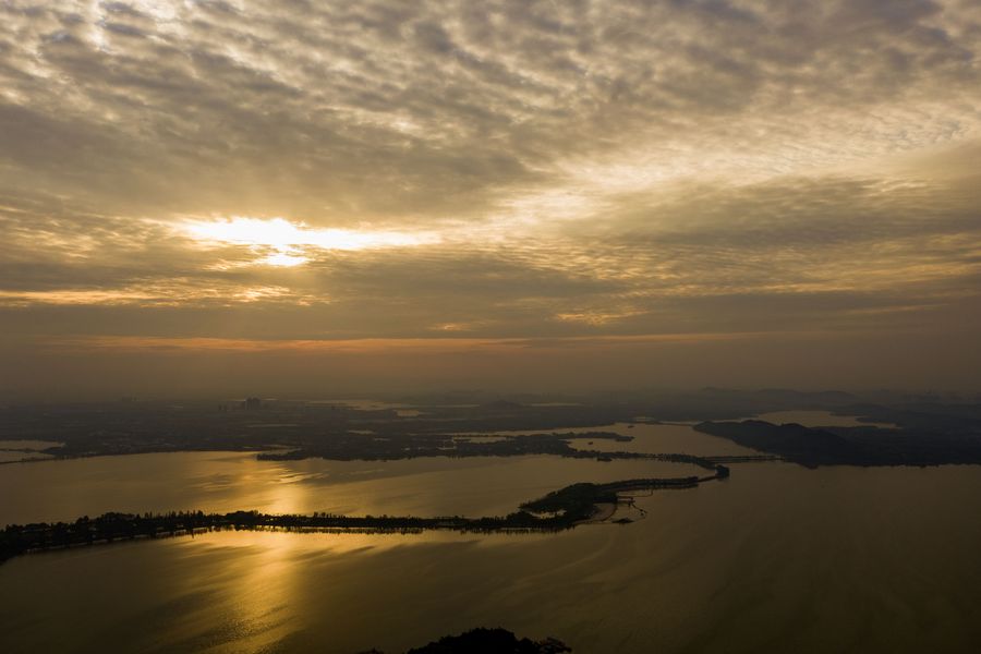 Aerial photo taken on April 14, 2020 shows the sunrise scenery in Wuchang of Wuhan, central China's Hubei Province. (Xinhua/Du Huaju)