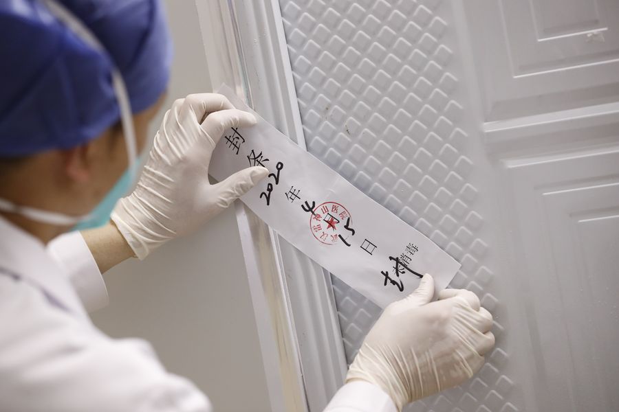 A nurse seals off a gate of Leishenshan (Thunder God Mountain) Hospital in Wuhan, capital of central China's Hubei Province, April 15, 2020. Wuhan Leishenshan (Thunder God Mountain) Hospital ceased operation in Wuhan on Wednesday as the coronavirus epidemic wanes. (Xinhua/Shen Bohan)