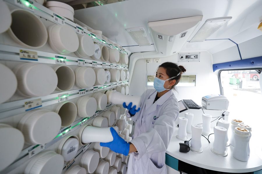 A medical worker takes boxes of concentrate granules from a shelf at the mobile emergency smart pharmacy for traditional Chinese medicine (TCM) at a temporary hospital in Jiangxia District in Wuhan, central China's Hubei Province, Feb. 26, 2020. (Xinhua/Shen Bohan)