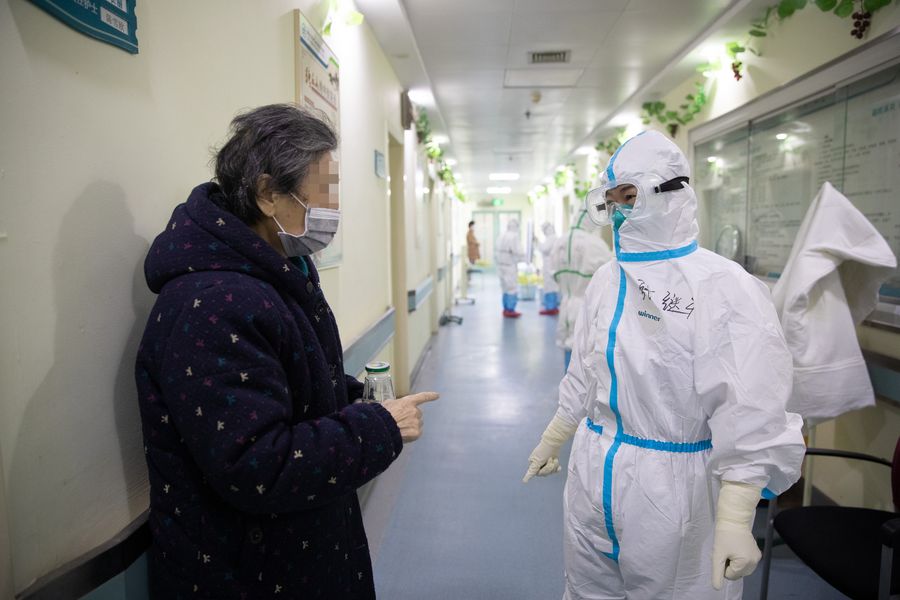 A doctor chats with a patient at the ward of the hospital in Wuhan, central China's Hubei Province, March 11, 2020. (Photo by Ke Hao/Xinhua)