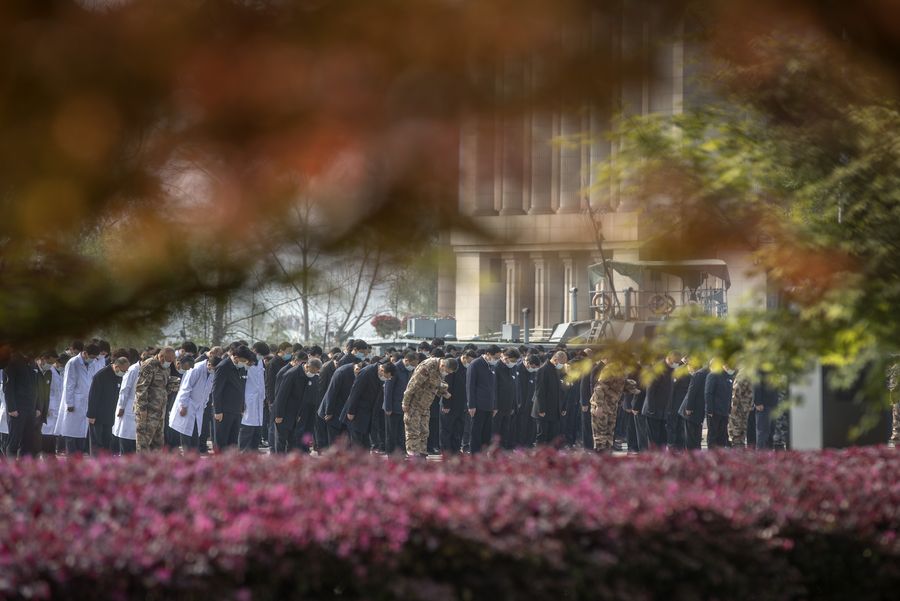 People pay a silent tribute to martyrs who died in the fight against the novel coronavirus disease (COVID-19) outbreak and compatriots who died of the disease in Wuhan, central China's Hubei Province, April 4, 2020. (Xinhua/Fei Maohua)
