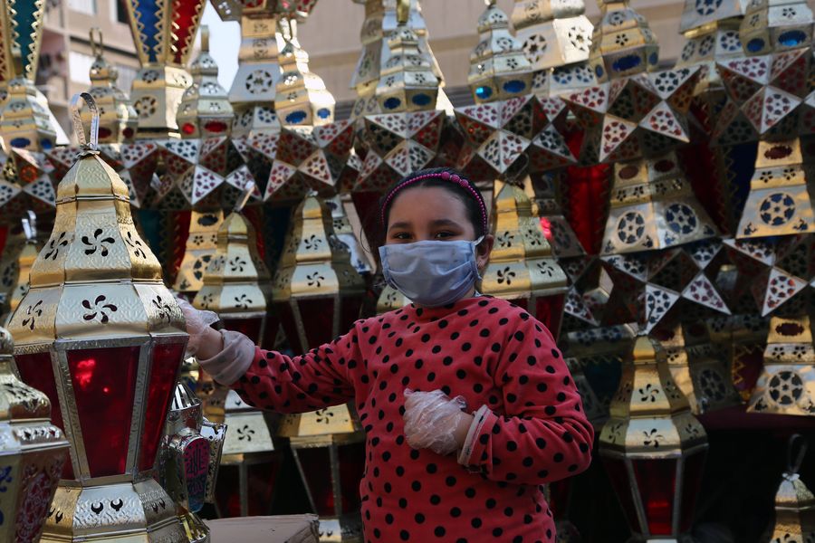 A girl shows traditional lanterns at a lantern bazaar in Cairo, Egypt on April 12, 2020. (Xinhua/Ahmed Gomaa)