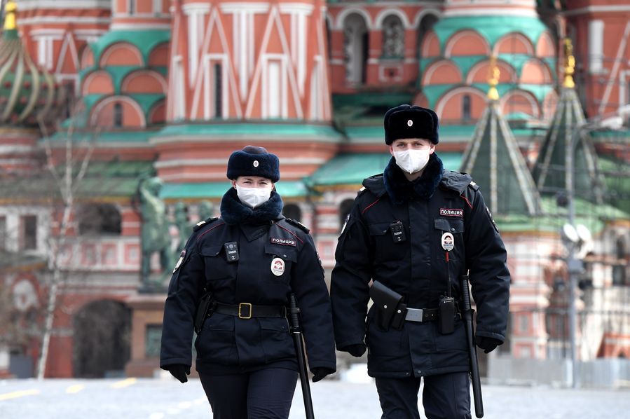 Police officers wearing face masks patrol on Red Square in Moscow, Russia, on April 6, 2020. (Sputnik/Handout via Xinhua)
