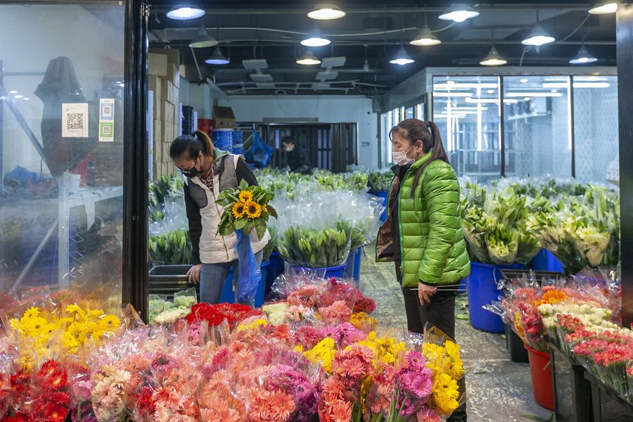 A customer buys flowers at a flower shop in east China's Shanghai, April 10, 2020. (Photo by Wang Xiang/Xinhua)