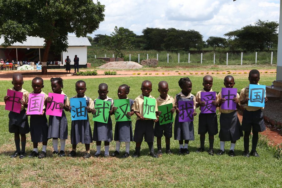 Children from Hossana Love in Africa Children's Home hold up placards with the Chinese characters of "Stay strong China, "Stay strong Wuhan, I love China" to support China, in Harare, capital of Zimbabwe, Feb. 21, 2020. (Xinhua/Zhang Yuliang)