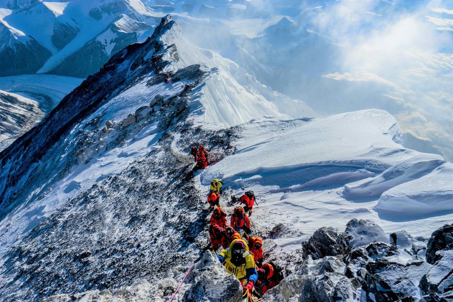 Photo taken on May 24, 2019 shows mountain guides scaling Mount Qomolangma in southwest China's Tibet Autonomous Region. (Photo by Zhaxi Cering/Xinhua)