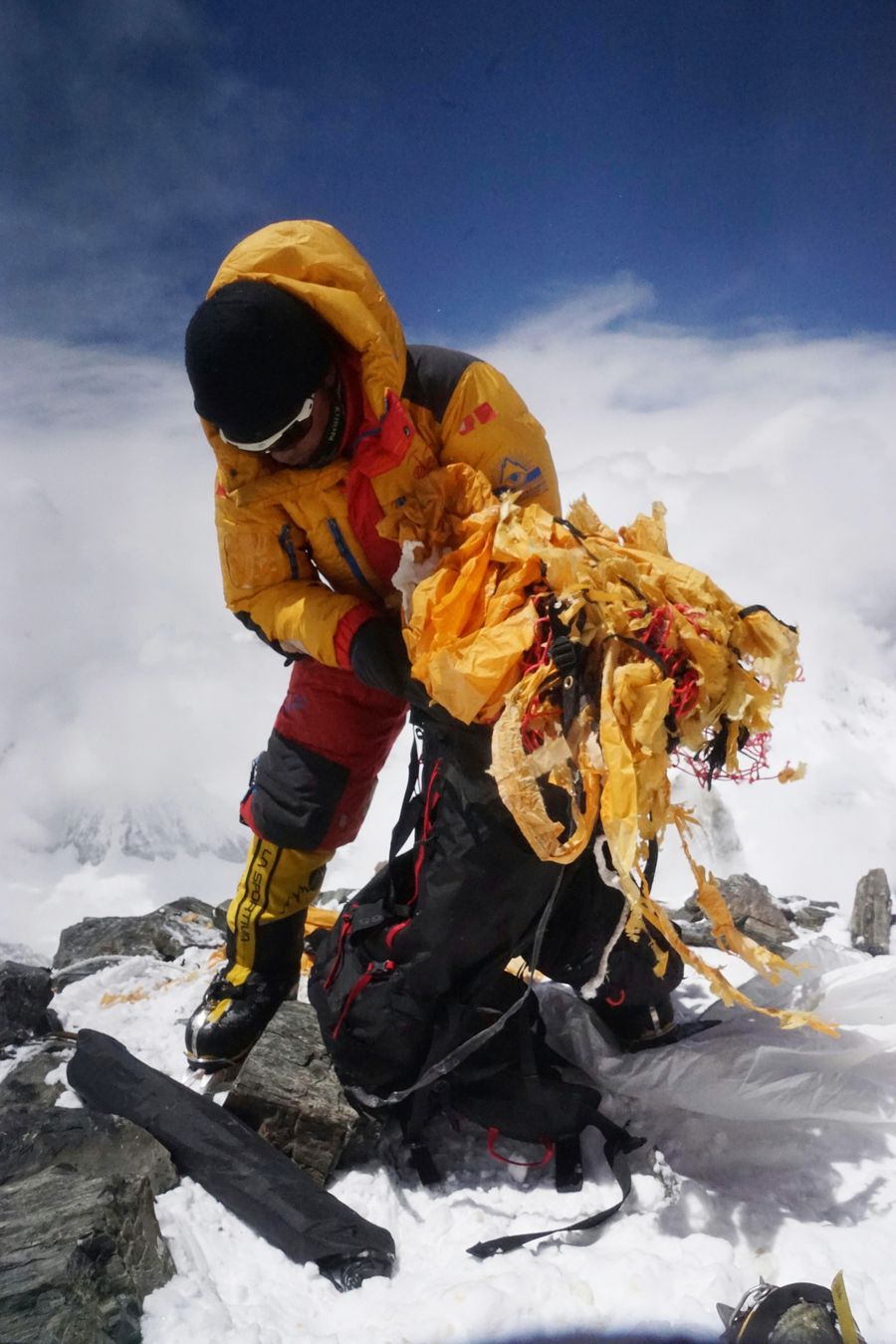 Cering Dandar collects garbage on Mount Qomolangma in southwest China's Tibet Autonomous Region in May 2018. (Xinhua)