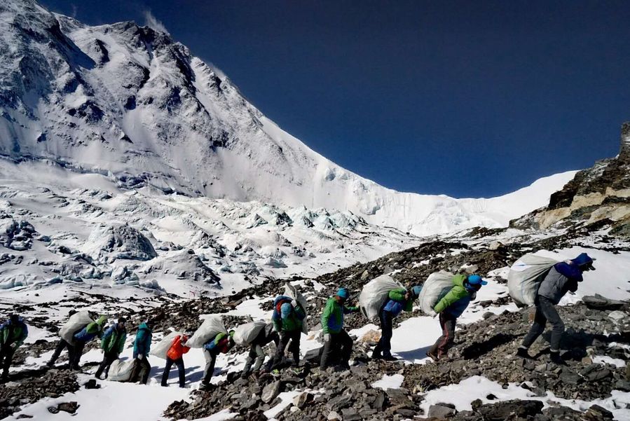 People carry garbage on Mount Qomolangma in southwest China's Tibet Autonomous Region in May 2018. (Xinhua)