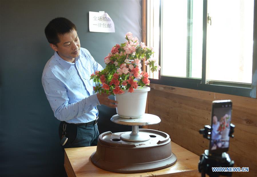 A staff member prepares for online promotion at the Tianlanlan flower cultivation base in Zhouning County, southeast China's Fujian Province, April 18, 2020. For years, Zhouning took advantage of local natural environment and promoted flower industry development. The county has over 2,000 mu (about 133 hectares) of flower and sapling planting area. The production value in 2019 topped 90 million yuan (about 12.7 million U.S. dollars), which helped over 40 households in poverty increase incomes. (Xinhua/He Canling)