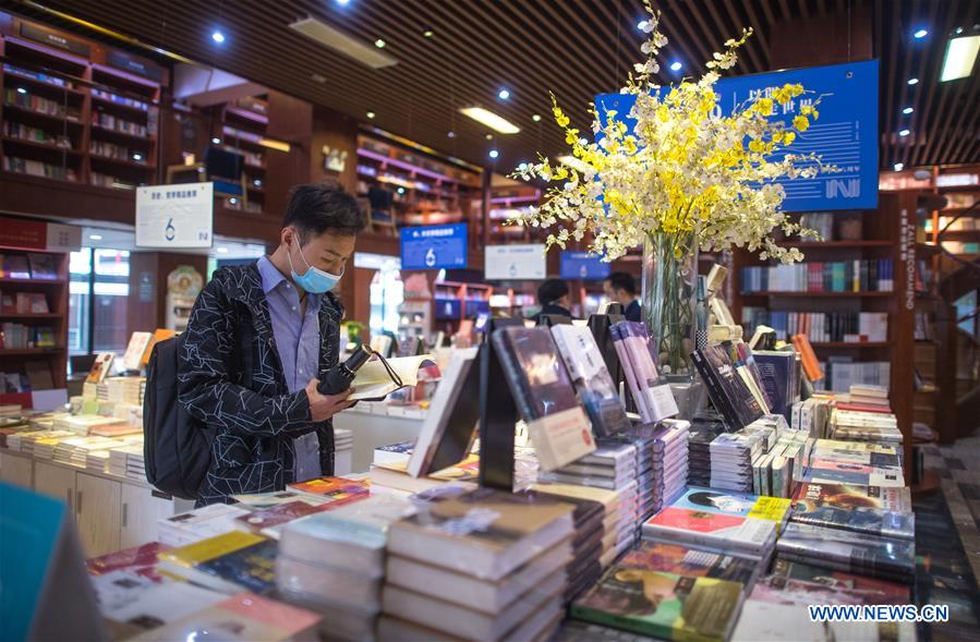Citizens view books at Zall Bookstore in Wuhan, central China's Hubei Province, April 18, 2020. Zall Bookstore in Wuhan was approved to resume business on Saturday, and citizens were attracted to the bookstore to read and buy books. Six reading corners were established in makeshift hospitals and medical observation stations, and nine online events were held for readers by the Zall Bookstore amid the COVID-19 outbreak. (Xinhua/Xiao Yijiu)