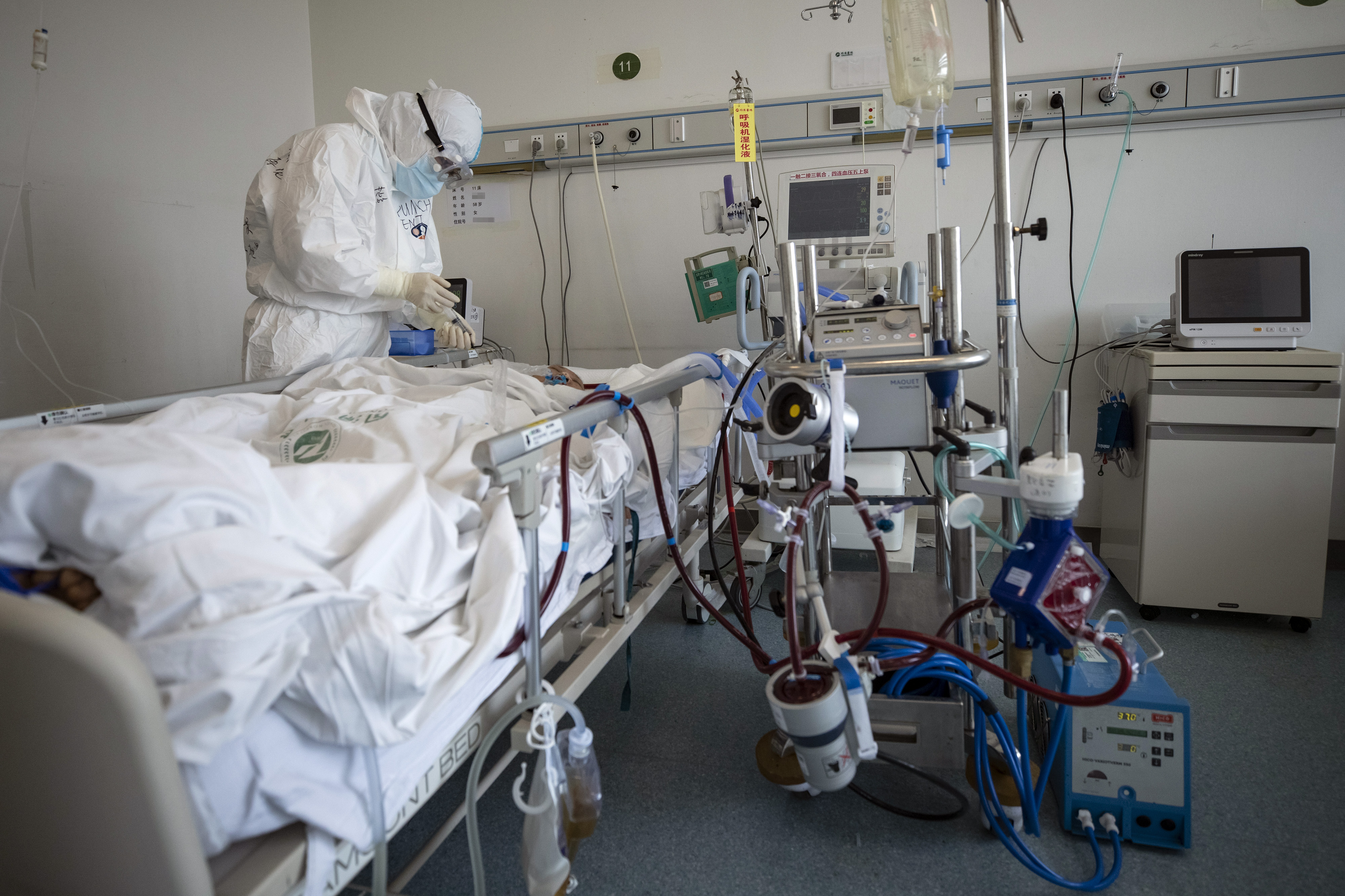 A medical takes care of a COVID-19 patient who is undergoing Extracorporeal Membrane Oxygenation (ECMO) and respiratory assistance at a ward at the Zhongfaxincheng campus of Tongji Hospital affiliated to Huazhong University of Science and Technology in Wuhan, central China's Hubei Province, April 12, 2020. (Xinhua/Shen Bohan)