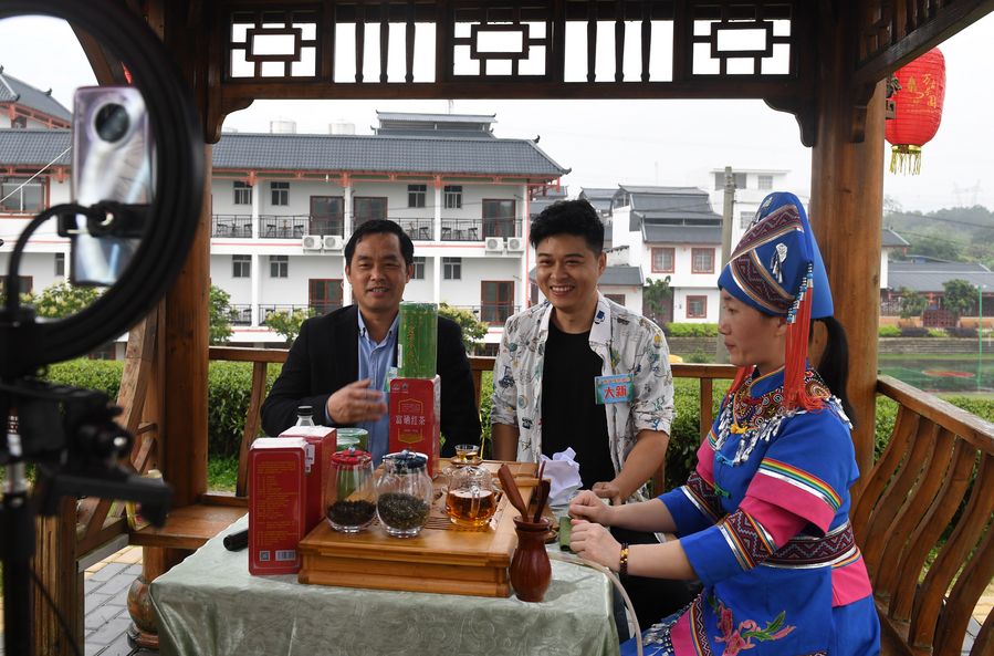 NANNING, April 19 (Xinhua) -- Holding a tin of jasmine tea, Hong Ben worked very hard in front of the camera. Through a livestreaming app on his mobile phone, Hong introduced the quality and flavor of the tea. Hong is not an ordinary livestreamer, but the deputy head of Hengxian County in southern China's Guangxi Zhuang Autonomous Region.
