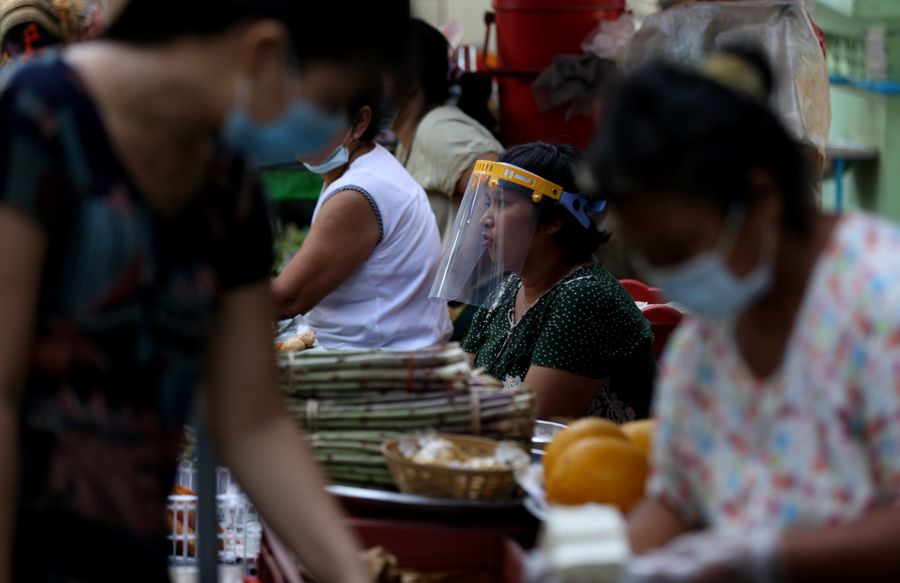 A vendor wearing a face shield waits for customers at a street market in Yangon, Myanmar, April 14, 2020. (Xinhua/U Aung) ■