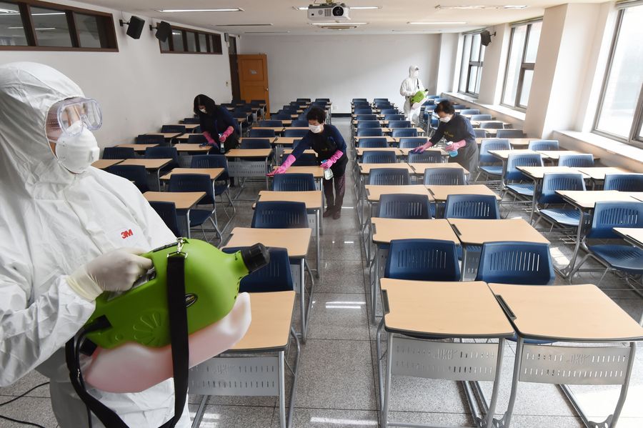 Staff disinfect the classroom at the Jukjeon Campus of Dankook University in Yongin of Gyeonggi Province, South Korea, April 7, 2020. (NEWSIS/Handout via Xinhua)