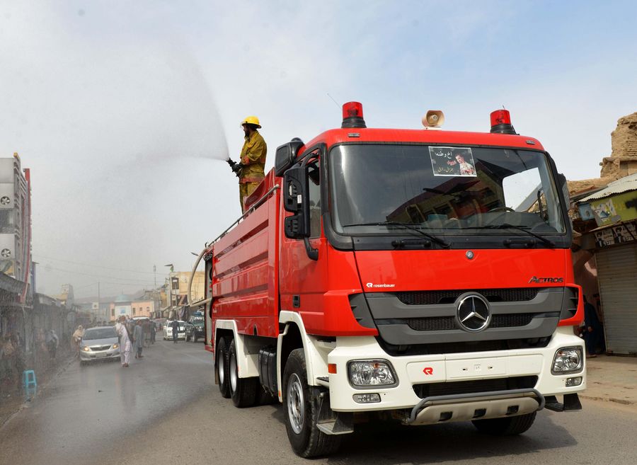 A firefighter sprays disinfectant in Kandahar, southern Afghanistan, April 11, 2020. (Xinhua/Sanaullah Seiam)