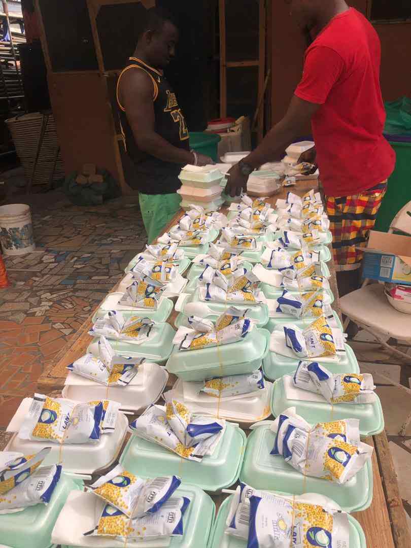 Workers from Lantianyi Company Ltd., a private Chinese food company in Ghana, prepared free food for locals in Accra, capital of Ghana, on April 19, 2020. (Xinhua)