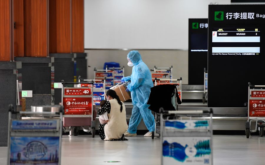 A staff member helps a passenger of flight MU2527 of China Eastern airlines to take luggage at the Phoenix International Airport in Sanya, south China's Hainan Province, April 8, 2020. (Xinhua/Yang Guanyu)