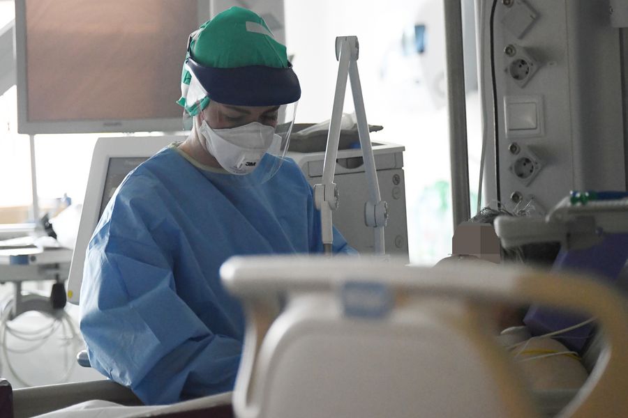 A medical worker works at Intensive Care Unit in Sant'Orsola-Malpighi hospital in Bologna, Italy, on April 15, 2020. (Photo by Gianni Schicchi/Xinhua)