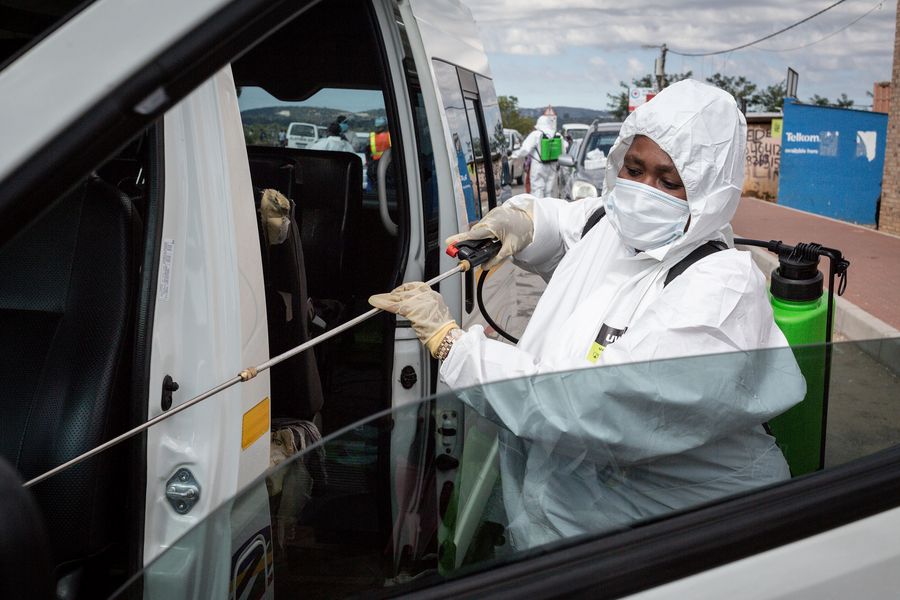 A staff member disinfects a car in Johannesburg, South Africa, April 16, 2020. (Photo by Yeshiel/Xinhua)