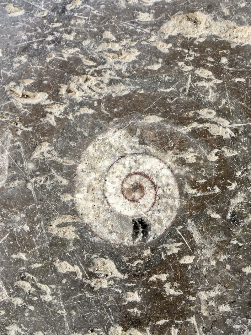 The fossils, in shapes of spirals, arcs, cones and ripples, are visible on public buildings, slate roads or steps, with some of their shells and microstructures discernible.