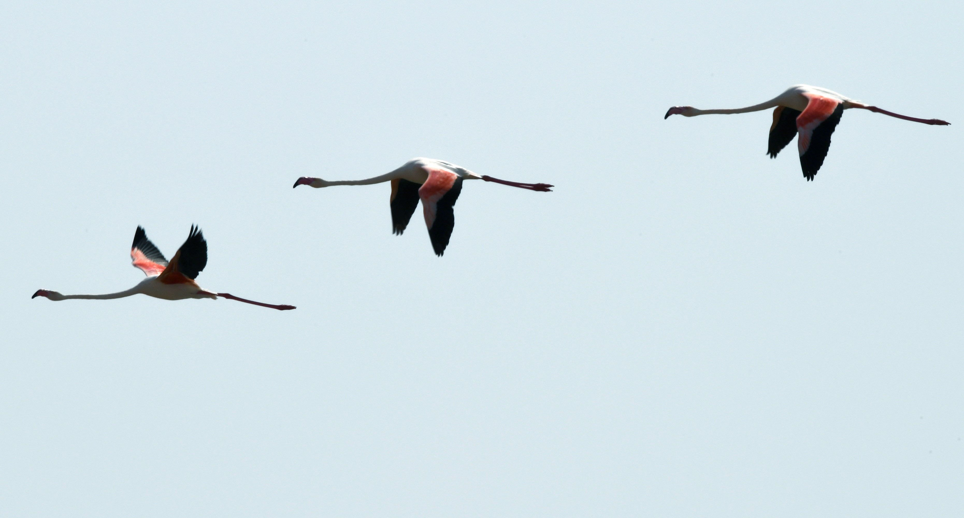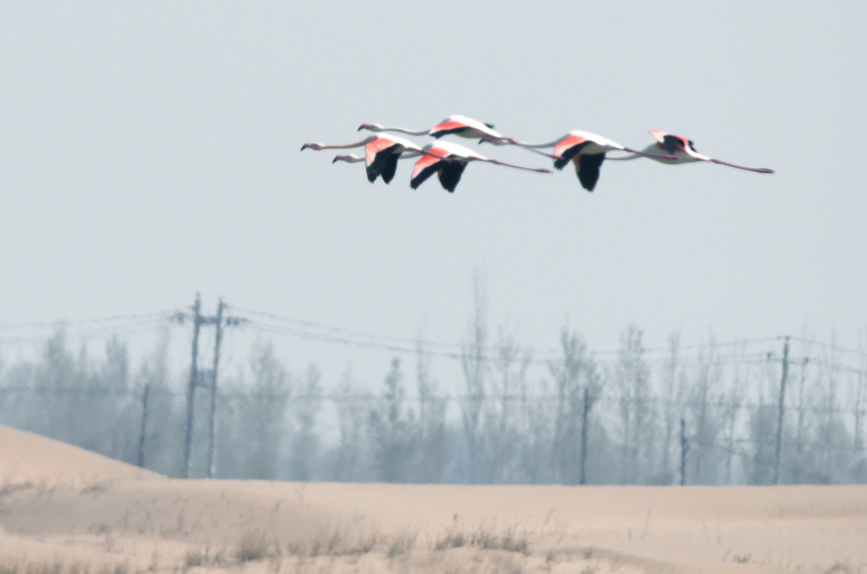 Five flamingos fly over a lake in the Ulan Buh Desert, northern China's Inner Mongolia Autonomous Region, April 16, 2020. (Xinhua/Li Yunping)