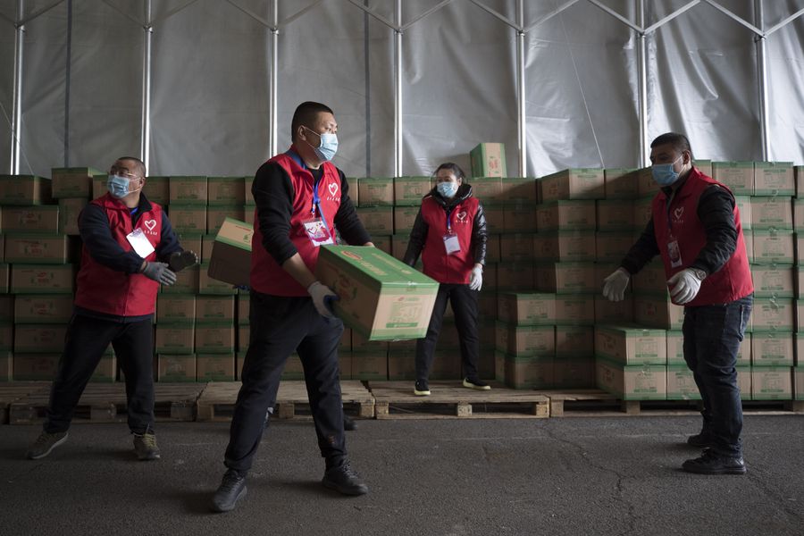 Volunteers transport relief supplies in Suifenhe, northeast China's Heilongjiang Province, April 19, 2020. A team of volunteers has been organized in Suifenhe, a border city facing a mounting challenge of imported cases, to help transport relief supplies from all parts of the country amid the fight against COVID-19 outbreak here. (Xinhua/Zhang Tao)