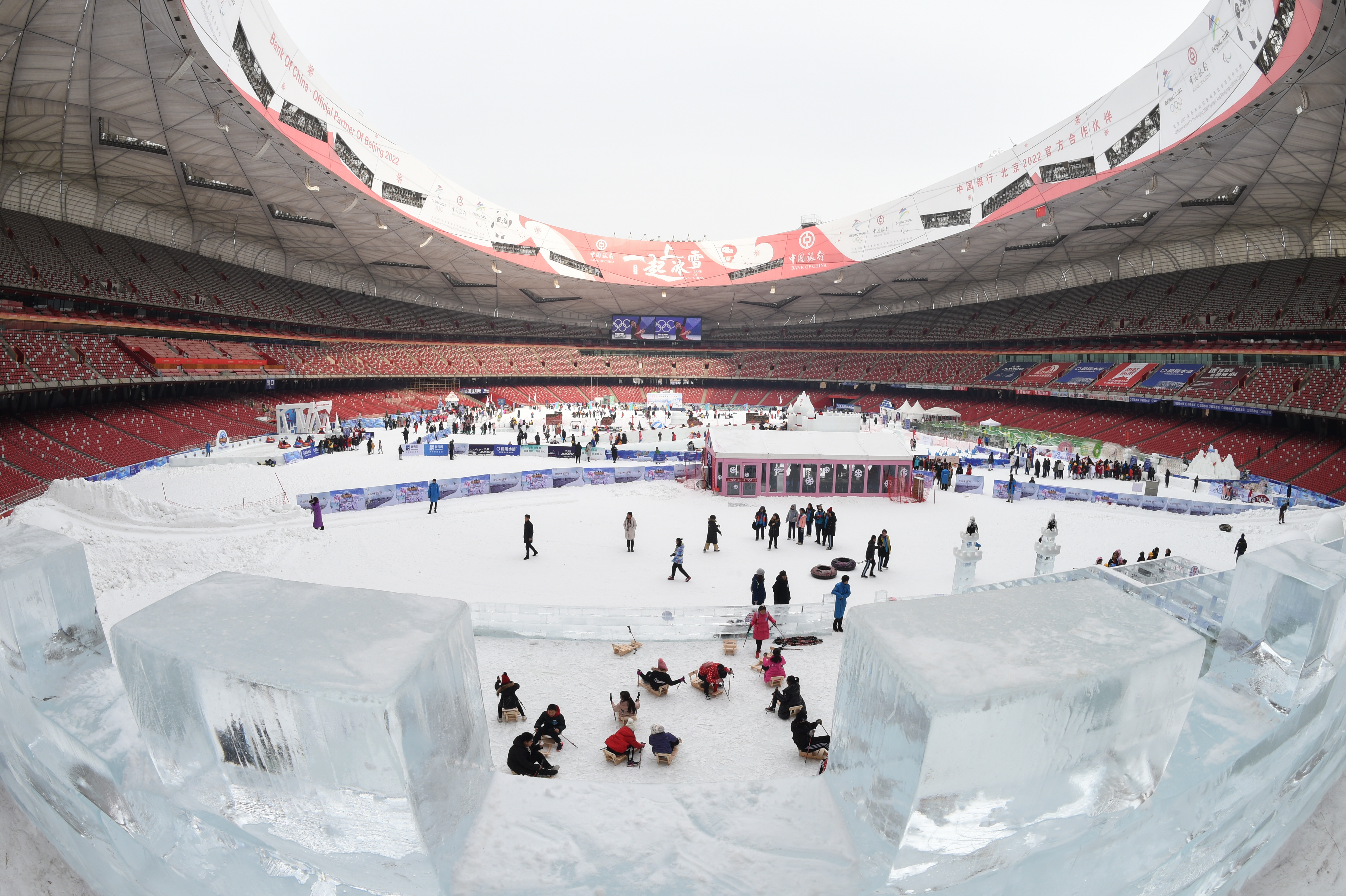 Students participating in the Olympic winter camp play at the National Stadium, or the Bird's Nest, in Beijing, capital of China, Jan. 2, 2019. (Xinhua/Ju Huanzong)
