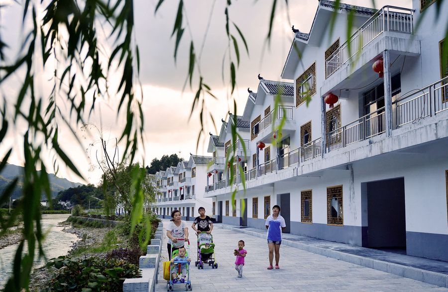 File photo taken on July 17, 2017 shows that people walk in a resettlement site for relocated residents from poor areas at Huangjiahe Village of Gaoluo Township in Xuan'en County, central China's Hubei Province. (Xinhua/Song Wen)