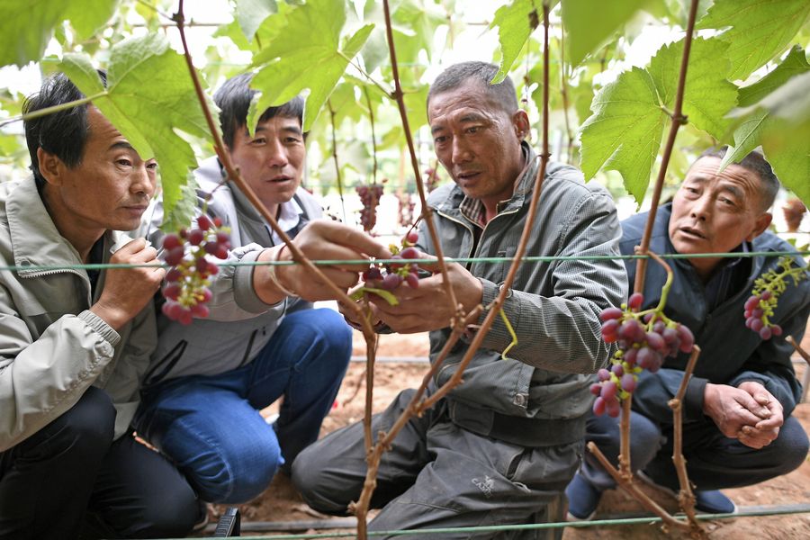A specialist (2nd R) explains grape-planting techniques to local farmers at an agricultural demonstration zone in Qingshan Township of Yanchi County, northwest China's Ningxia Hui Autonomous Region, May 27, 2019. (Xinhua/Wang Peng)