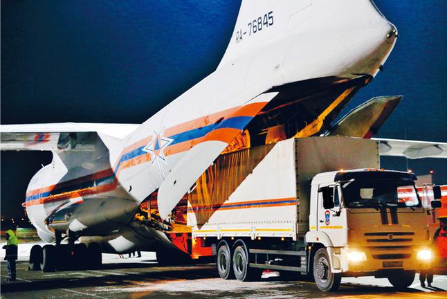 Staff loading a cargo plane with the medical aids provided by Russian government to China at the Zhukovsky International Airport near Moscow, Russia, February 8, 2020.