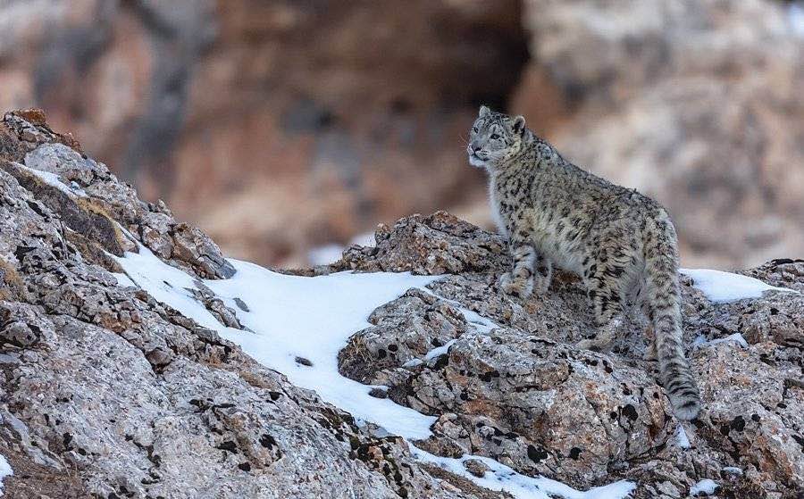 In September, he chose a cave and camped alone. It was snowing. After waiting four days, he spotted with his binoculars a snow leopard with a cub.