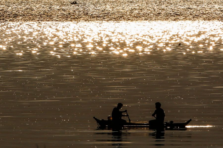 People row a boat during sunset in Manila Bay in Pasay City, the Philippines on April 22, 2020. (Xinhua/Rouelle Umali) ■