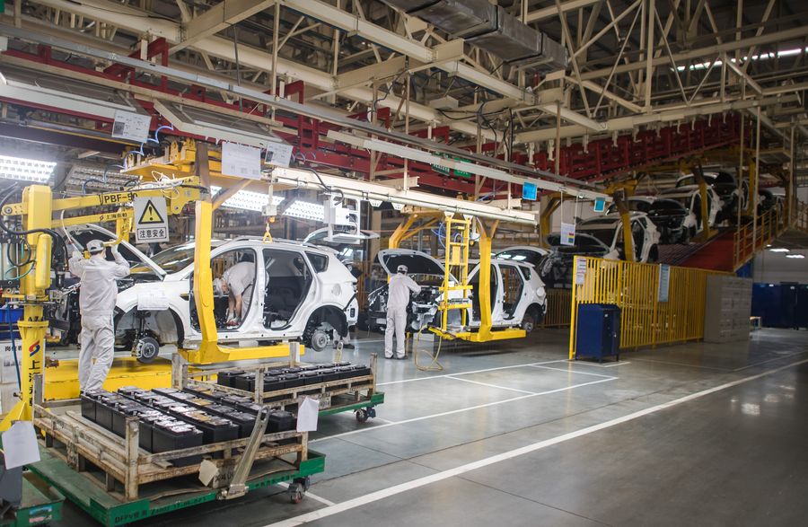 Workers are busy on the production lines at the workshop of Dongfeng Passenger Vehicle Company in Wuhan, central China's Hubei Province, March 24, 2020. (Xinhua/Xiao Yijiu)