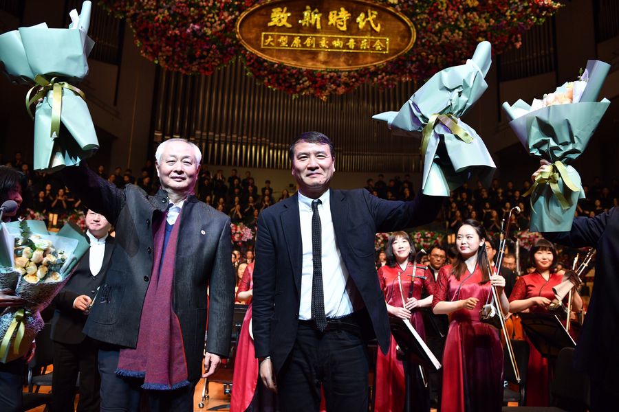 Composers Zhao Jiping (L, front) and Ye Xiaogang (R, front) answer the curtain call during a "new era" original symphony concert held in Beijing, capital of China, Jan. 14, 2019. (Xinhua/Jin Liangkuai)