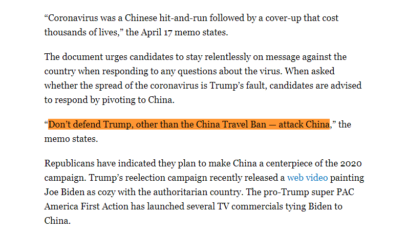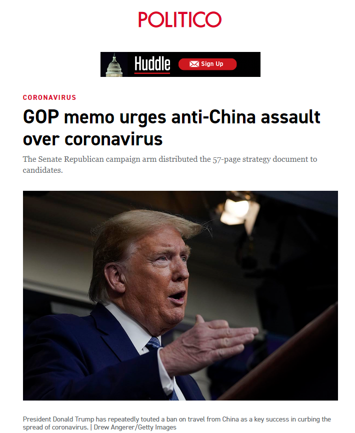 Screenshot of a Politico report published on April 24, 2020 unveils a detailed memo sent by the National Republican Senatorial Committee (NRSC) to GOP campaigns. The memo advised Republican candidates to address the COVID-19 pandemic by aggressively attacking China.