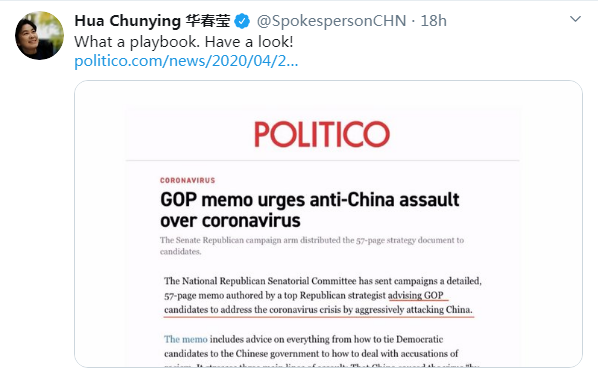 Screenshot of Chinese Foreign Ministry spokeswoman Hua Chunying's tweet on April 25, 2020 (Beijing time) in response to the anti-China memo.