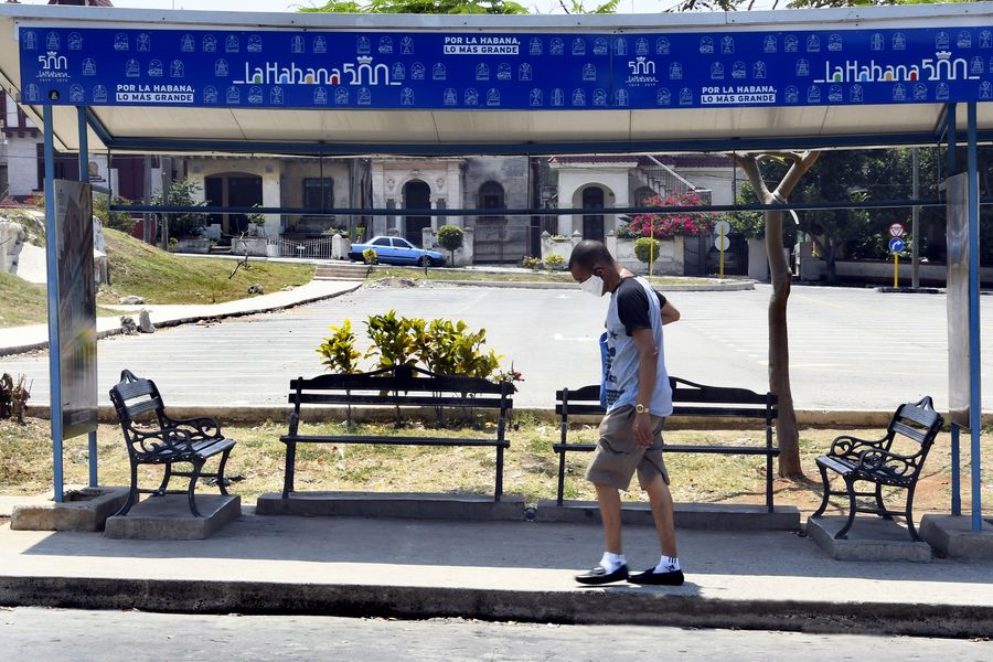 A man wearing a mask walks past a bus station in Havana, Cuba, April 11, 2020. (Xinhua/Zhu Wanjun)