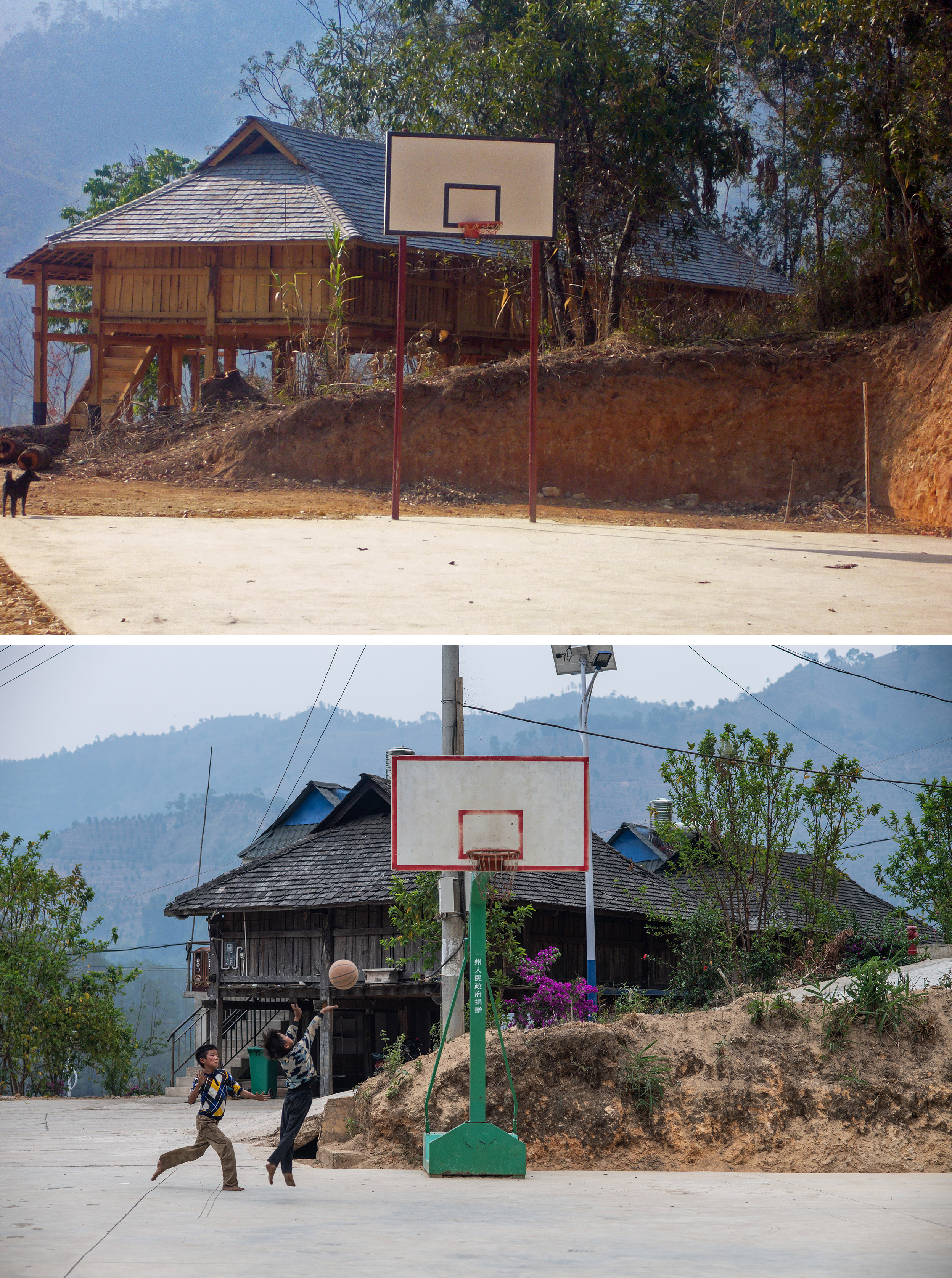 Combo photo shows the basketball playground in 2010 (top) and the same basketball playground on April 12, 2020 (taken by Hu Chao) at Manbansandui Village in Menghai County, southwest China's Yunnan Province. (Xinhua)