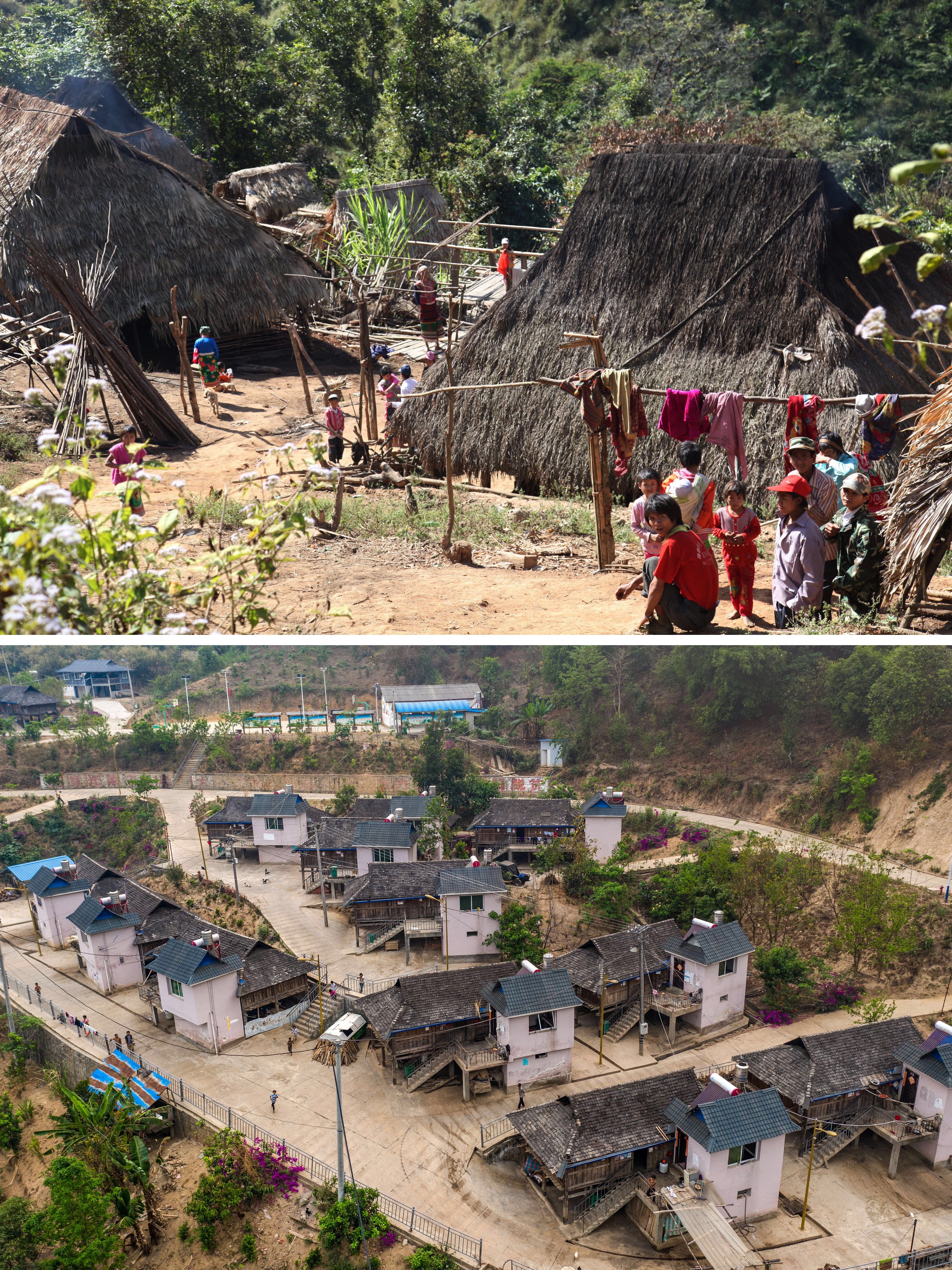 Combo photo shows the dwellings before relocation (top) and the relocated dwellings on April 9, 2020 (taken by Hu Chao) at Manbansandui hamlet in Menghai County, southwest China's Yunnan Province. (Xinhua)