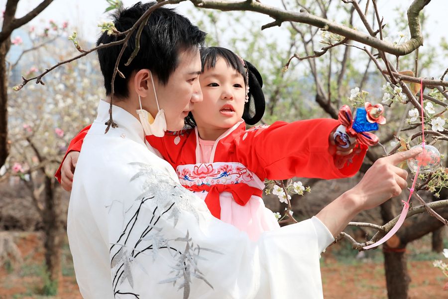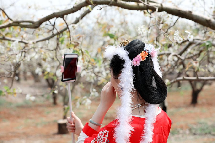 KUNMING, April 27 (Xinhua) -- Putting up her hair in a bun adorned with an elaborate hairpin and wearing a long gown with embroidery and loose sleeves, 19-year-old Chen Xi might be mistaken for a time traveler from centuries ago if not for her face mask and cellphone.
