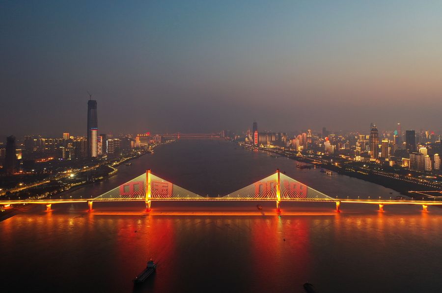 Aerial photo taken on April 12, 2020 shows the night view at Wuchang District of Wuhan, central China's Hubei Province. (Xinhua/Zhao Jun)