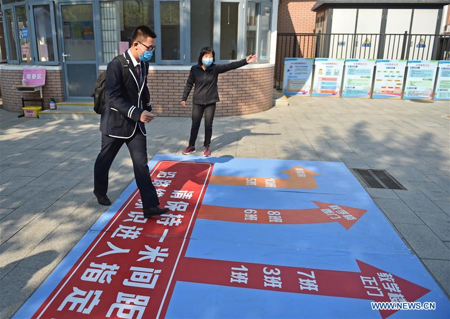 A student follows marks on the ground to head for his classroom at Guangqumen Middle School in Beijing, capital of China, April 27, 2020. Senior high schools in Beijing on Monday restarted classes for seniors, who will take the national college entrance exam on July 7-10. (Xinhua/Chen Zhonghao)