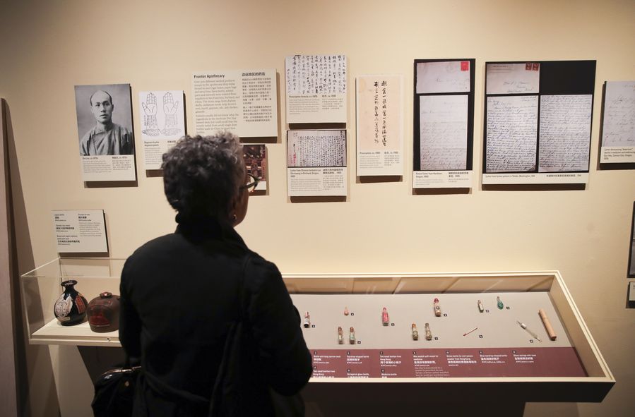 A journalist looks at exhibits in the Museum of Chinese in America in New York, the United States, April 25, 2018. (Xinhua/Wang Ying)
